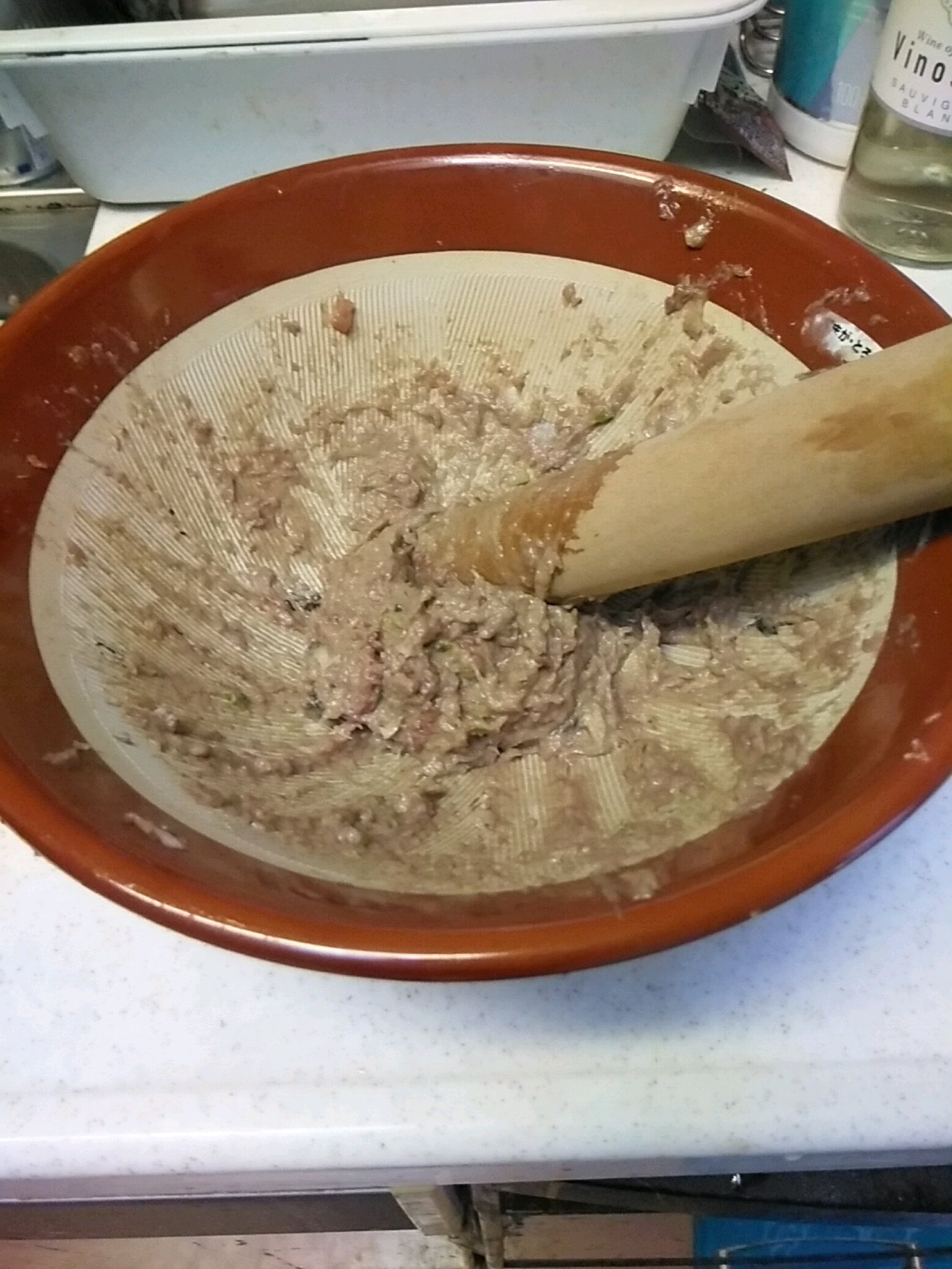 まずはイワシをさばいて、すりこぎを使い練ります。