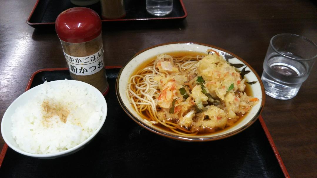 小職もかつお節問屋直営のつゆを味わうため、温かいそばをチョイス。かき揚げそば(410円)と半ライス(90円)、この2つでもワンコインです。更にかつお節問屋直営とあって、ご飯には「粉かつお」がかけ放題というのが嬉しいところ。(尚、ライス、半ライス単品の注文はできません)