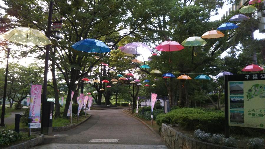 こちらは、公園入口。梅雨時とあってカラフルな傘がお出迎えです。