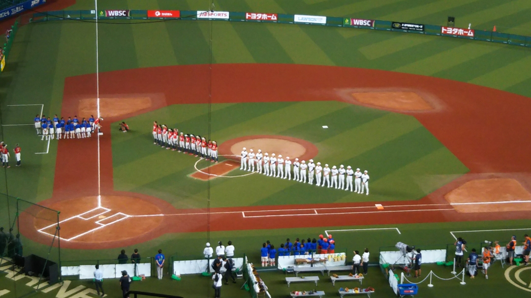 いよいよ試合開始。日本は山本選手の先制2ランでリードしましたが5回にホームランで追いつかれ、延長8回に無念のサヨナラ負け・・・。7回の満塁のピンチでファースト・洲鎌選手の好守など、見せ場も多かっただけに勝ちきれなかったのが残念でした・・・。写真は、先制2ランを打って生還する山本選手です。