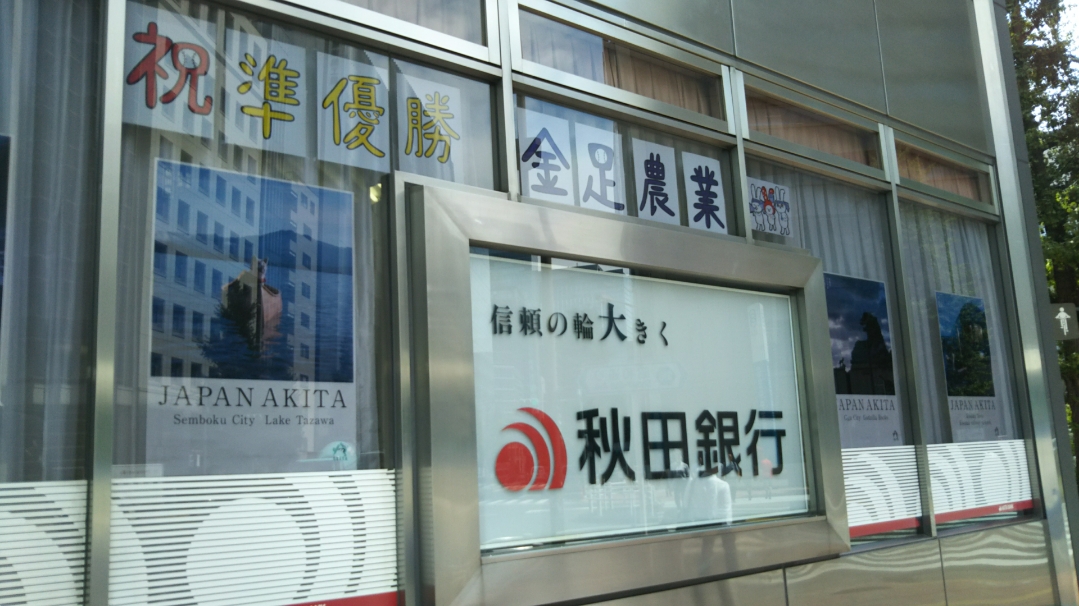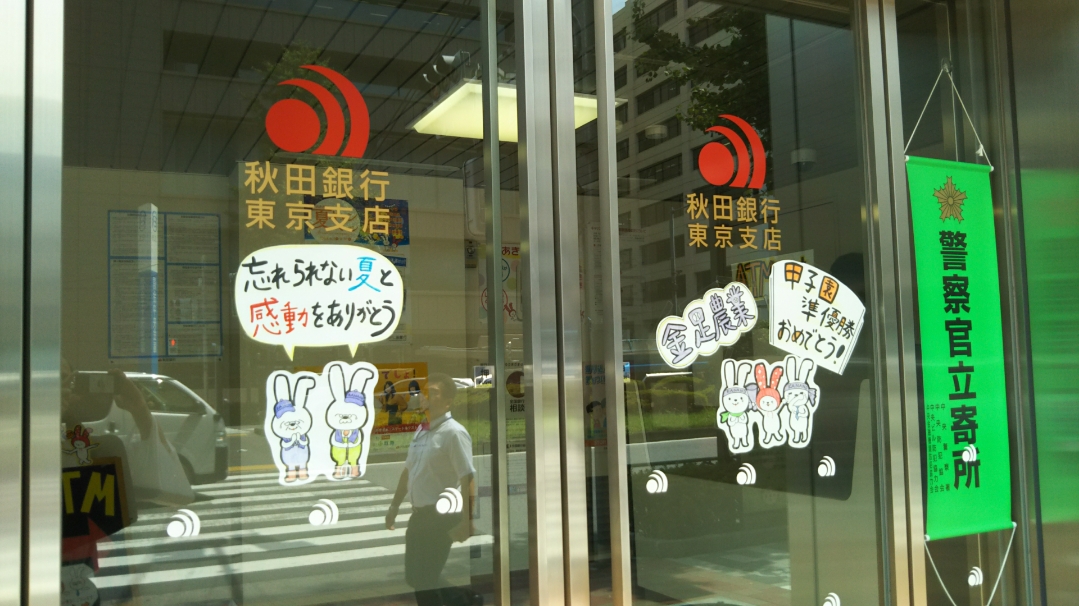 こちらは、わが東信商事と交差点を挟んだはす向かい側にある秋田銀行・東京支店さんです。ご覧のように金足農業高校の健闘を称えるメッセージが。(※注・撮影は8月下旬)
